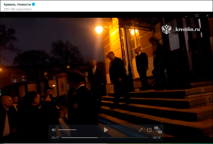 Виктора Орбана поздним вечером провожают из Кремля. Скриншот: телеграм-канал "Кремль. Новости"