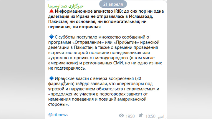 Между тем иранские СМИ утверждают, что ни одна иранская делегация в Исламабад не отправлялась. Скриншот: ТГ-канал телерадиокомпании IRIBnews (автоперевод)