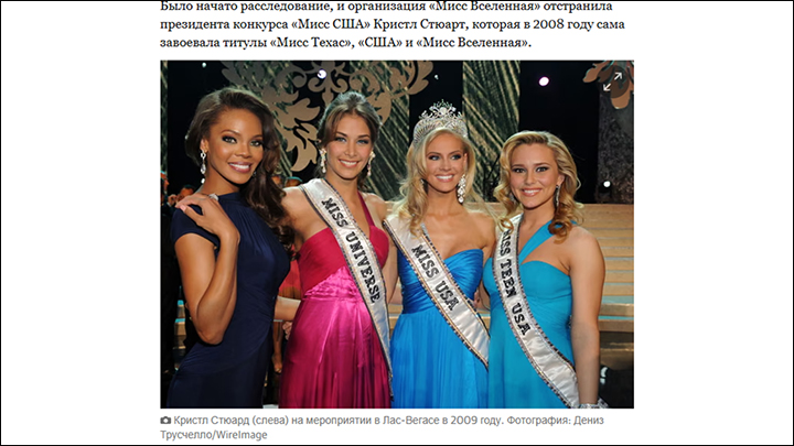По итогам расследования организация "Мисс Вселенная" отстранила президента конкурса "Мисс США" Кристл Стюарт. Скриншот: theguardian.com