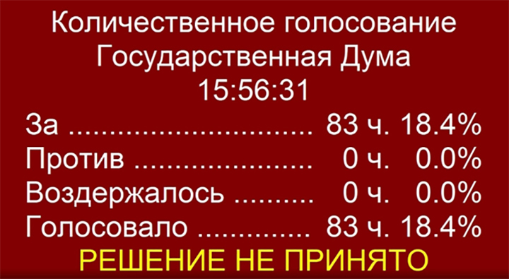 Результаты — как под копирку: участие в этих голосованиях принимали от 51 до 110 депутатов. Все голосования — единодушно "за", но необходимого кворума для принятия решения во всех семи случаях не было.