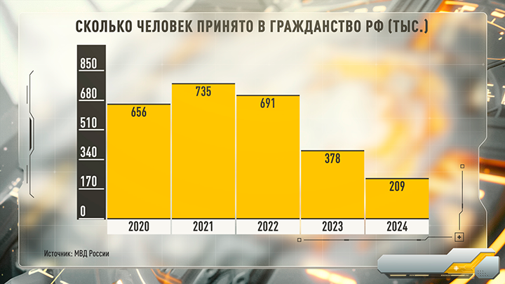 Ежегодно сотни тысяч иностранцев становятся гражданами России. В рекордном 2021 году таких насчитывалось 735 тыс. человек. В 2023-2024 годах показатель заметно снизился, но в МВД этот факт объясняют "ужесточением миграционной политики", а также тем, что большинство жителей новых регионов успели получить паспорта в упрощённом режиме в предыдущие годы.