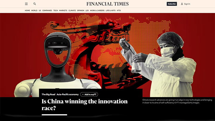 Та же Financial Times пишет, что "Китай выигрывает гонку инноваций", стремительно превращаясь в "мировую лабораторию". Скриншот: FT