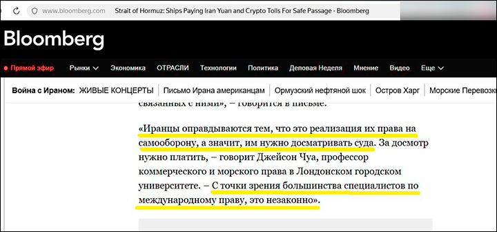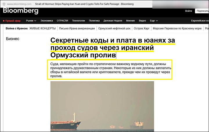 И тут подоспел инсайд от американского агентства Bloomberg, многое расставивший по своим местам и обрисовавший общую схему, по которой Иран уже начал зарабатывать от 1 млн до 2 млн долларов с каждого судна, прошедшего через пролив.