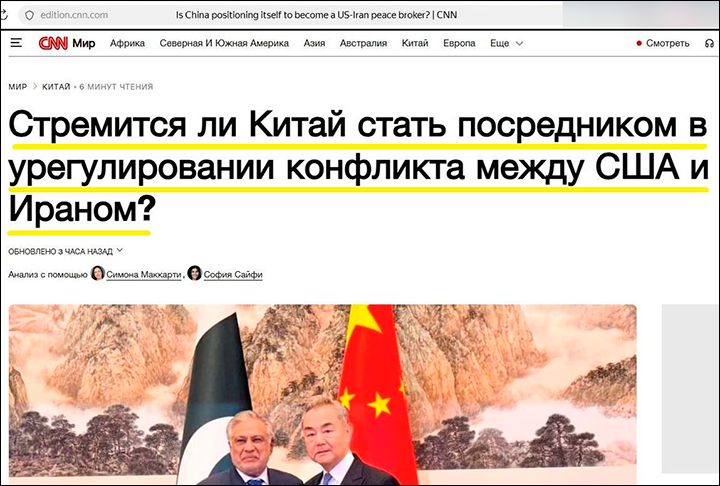 Действительно, кроме церемониальных заявлений "Остановите боевые действия" и "Мы за мир во всём мире" никаких реальных шагов со стороны Пекина не последовало. А специальный посланник Китая на Ближнем Востоке Чжай Цзюнь открыто заявил, что разбираться с кризисом должны его виновники, то есть США и Израиль: