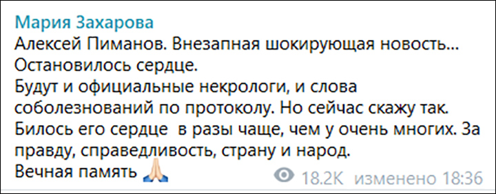 Алексей Пиманов умер на 65-м году жизни. Остановилось сердце. Скриншот: ТГ-канал @news_1tv