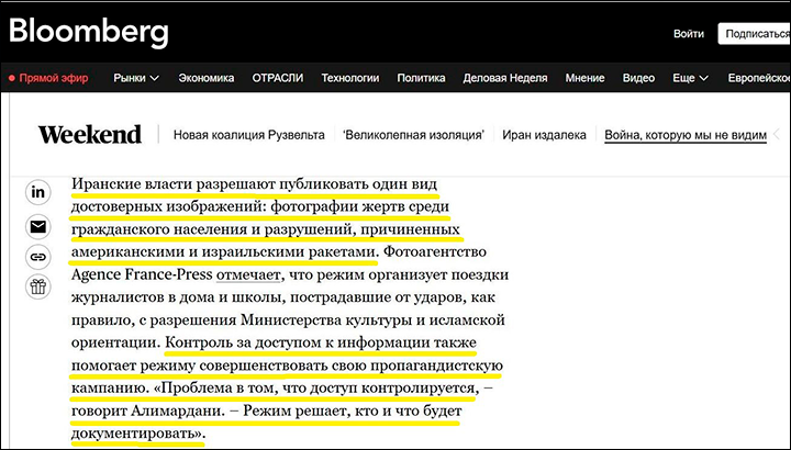 Запад недоволен: Иран не играет в поддавки в информационной войне, сведений для пропаганды не хватает // Скриншот: интернет-сайт bloomberg.com (автоперевод)