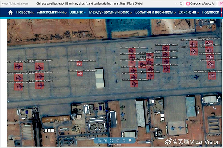 Мало того что MizarVision собрал не только массив снимков высокого качества, доступный  китайскому "спутниковому флоту", но и снимки коммерческих спутников. Гораздо важнее, что стартап из Поднебесной начал с 24 февраля (за несколько дней до атаки на Иран) публиковать эти данные в уже обработанном ИИ-алгоритмом виде.