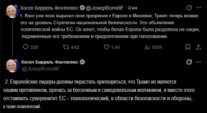 Надо признать: Боррель вдумчиво ознакомился с новой Стратегией нацбезопасности США – всё так и есть. Но правда, он при этом и кое-что выдал. Например, что Брюссель не хочет "белой Европы", в связи с чем и распахнул для миллионов мигрантов её двери с Юга, плотно закрыв их на Востоке. А также, что евробюрократы из "отдельных стран" пытаются слепить агрессивную сверхдержаву.