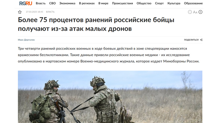Три четверти ранений российских военных в ходе боевых действий в зоне спецоперации наносятся вражескими беспилотниками. Скриншот: РГ.ру