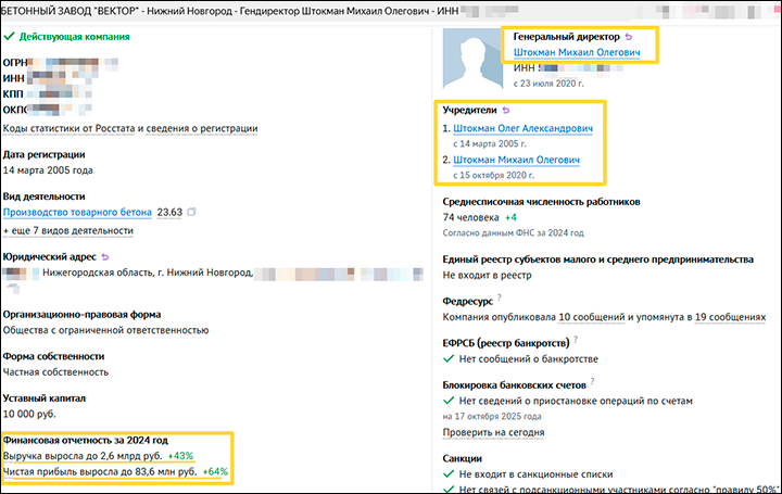 Семья Штокманов управляет весьма прибыльным бизнесом. Скриншот с сайта checko.ru