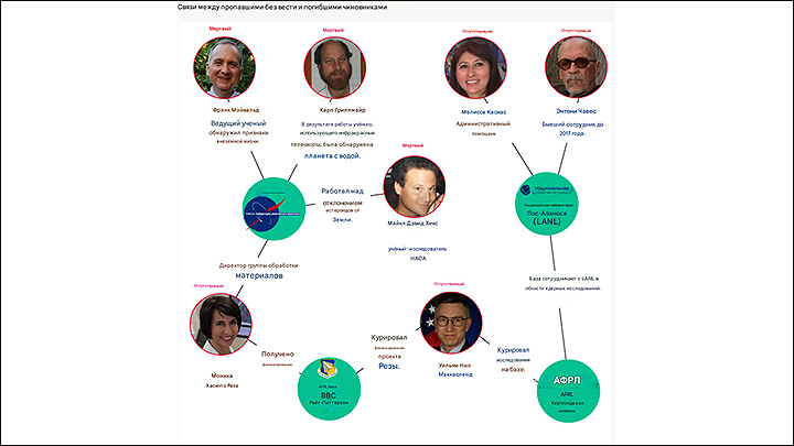 Что скрывают исчезновения отставного генерал-майора ВВС Уильяма Нила Маккасланда, специалиста по материалам компании AeroJet Rocketdyne Моники Резы, биолога компании Novartis Джейсона Томаса и сотрудников Национальной лаборатории Лос-Аламоса Мелиссы Каслас и Энтони Чавеса, а также смерть Хикса, Фрэнка Майвальда из НАСА, Нуно Лурейро из Массачусетского технологического института и Карла Гриллмэра из Калифорнийского технологического института?
