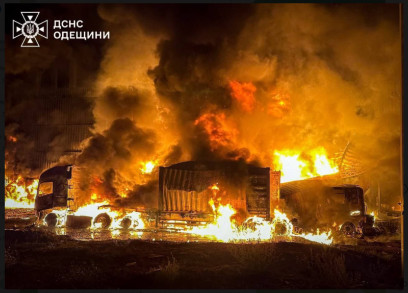 Есть минимум одно попадание в ПВО, "Гепард" или "Пэтриот" - доподлинно неизвестно. Есть прилёты по фурам, которые в этот момент загружались военными "приблудами". Сегодня будет большой шухер, ибо забаранили кого-то очень весомого с Запада и всю его команду встречающих. Видимо, привезли что-то "вкусное", что разгружали сразу и сразу направляли из порта,