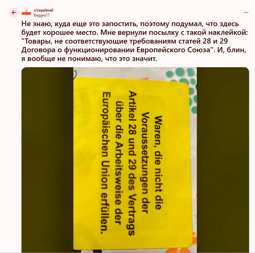 Проблем с посылками много на границах с Австрией и Германией. Таможенники там отделяют посылки из России и отказываются их пропускать. Говорят, не позволяют статьи 28 и 29 Договора о функционировании Евросоюза. Даже наклейку соответствующую клеят.